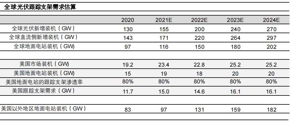 隨著跟蹤支架持續技術迭代,其經濟性和可靠性等方面的性能持續提升,相對固定支架的優勢有望進一步凸顯,從而推動跟蹤支架滲透率的提升。我們估算,未來3年內,全球跟蹤支架需求有望達到34%,美國以外地區的跟蹤支架需求的復合增速有望達到45%。
