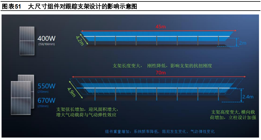 值得注意的是,隨著組件端的技術迭代加快,其中大尺寸趨勢越來越明顯。組件的技術迭代會推動跟蹤支架的技術升級。